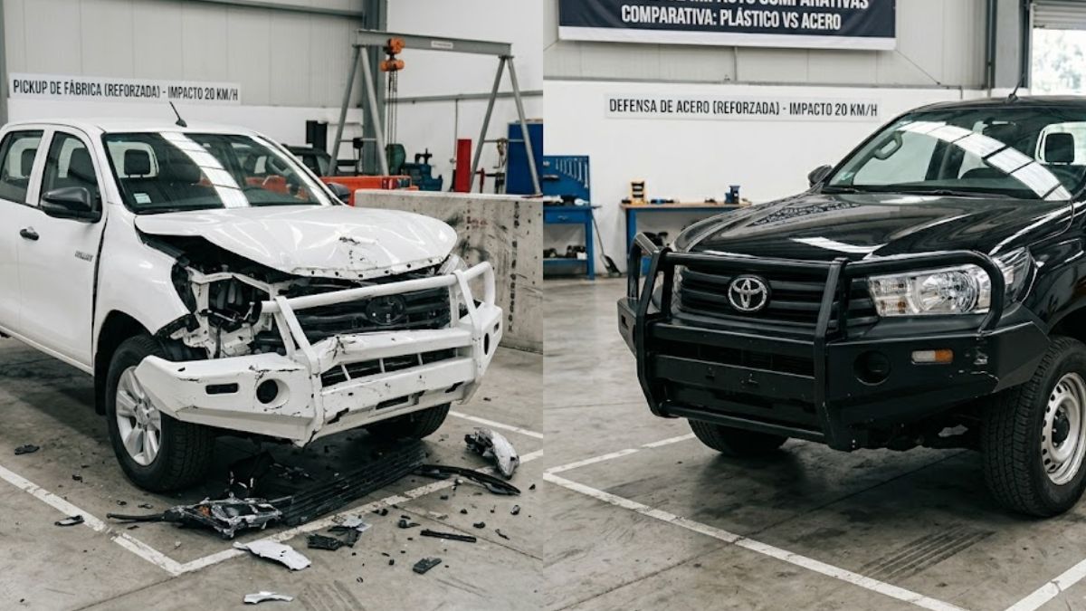 Las pickups de fábrica traen un fascia frontal y un parachoques trasero de plástico (o plástico con refuerzo metálico ligero). Estos componentes están diseñados para absorber impactos menores a velocidad de estacionamiento (~5–8 km/h) y cumplir normativas de peatones. Fuera de esa función, no protegen nada.