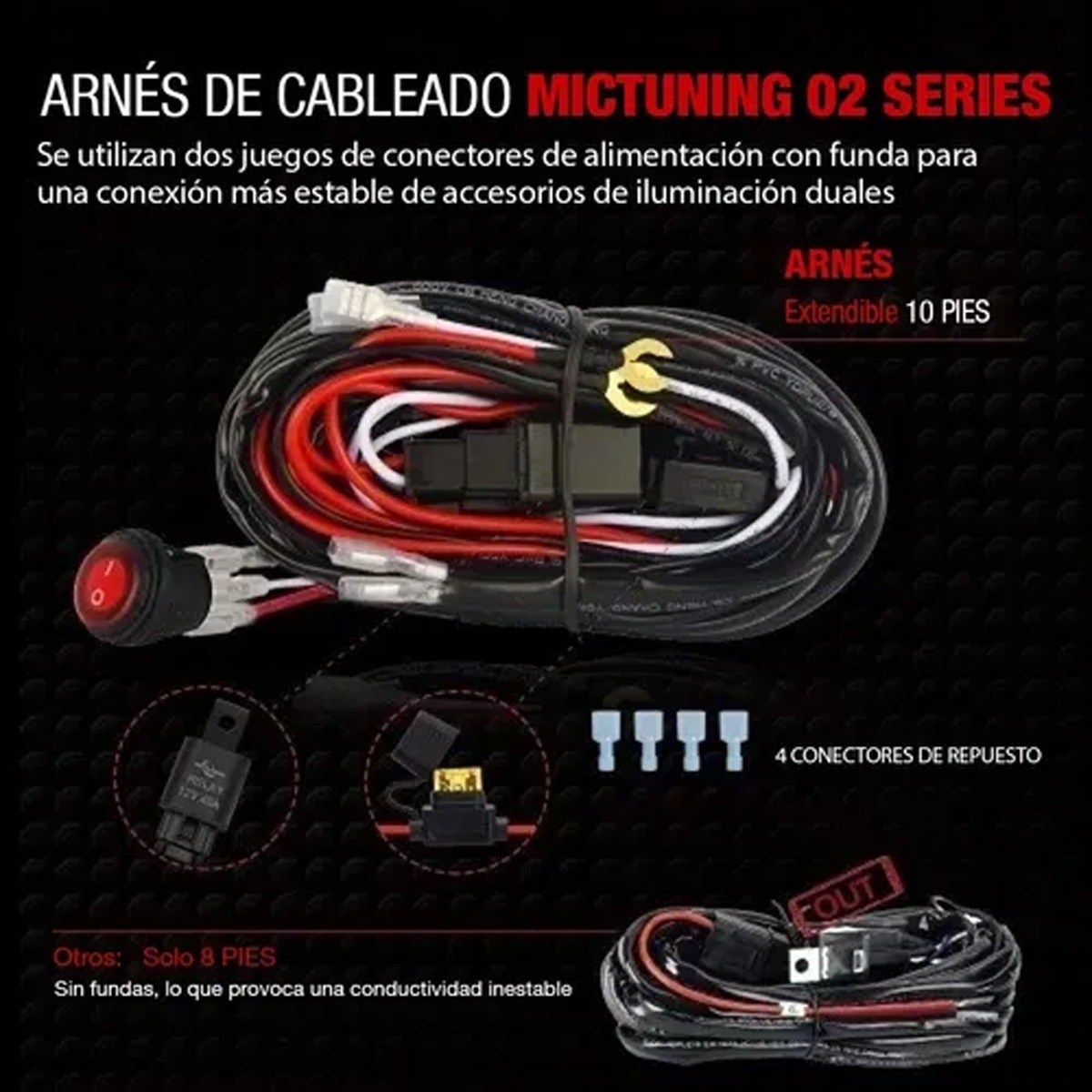 * El producto incluye: interruptor de encendido / apagado + relé de potencia + fusible de cuchilla + 10 pies de arnés de cableado + 2 juegos de conector de alimentación a la lámpara.