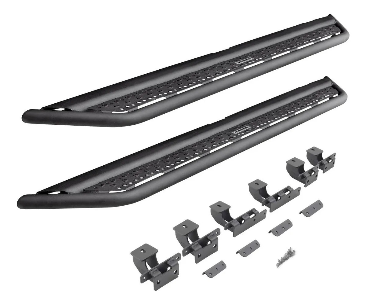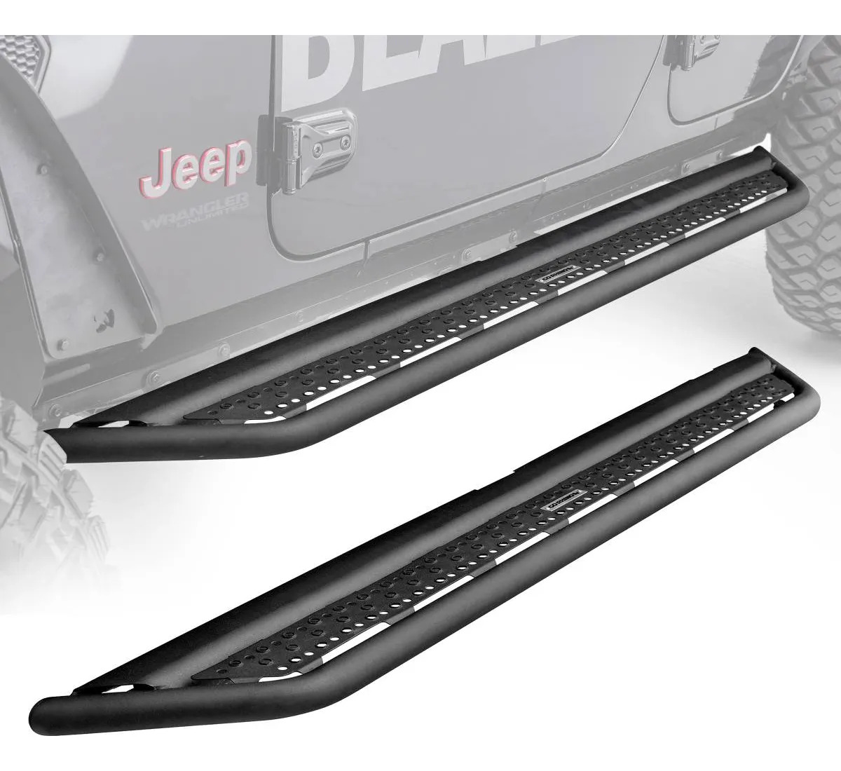 Cuenta con una placa que corre a lo largo del estribo con un patrón de perforaciones antiderrapantes y área de pisado de 6". Se monta al ras del vehículo para librar cualquier obstáculo en el camino.