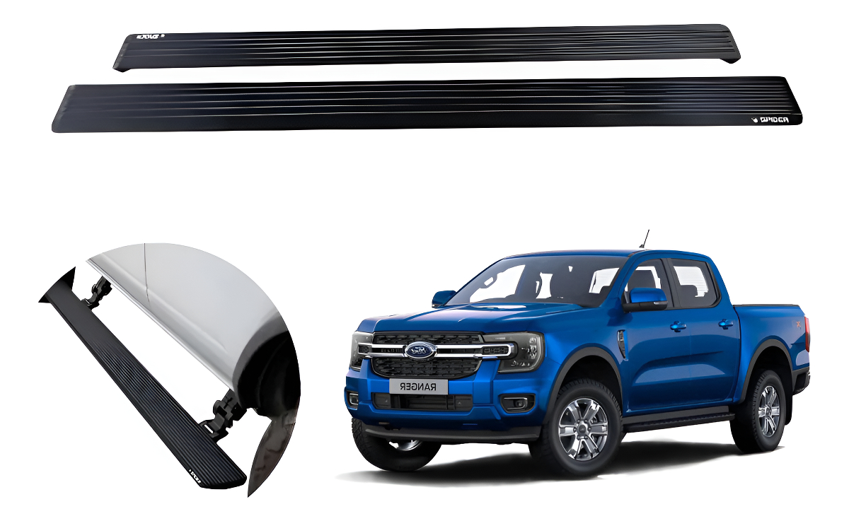 Estribos eléctricos automáticos con luz integrada, diseñados específicamente para Ford Ranger. Se activan al abrir y cerrar las puertas, facilitando el acceso al vehículo y mejorando la seguridad.