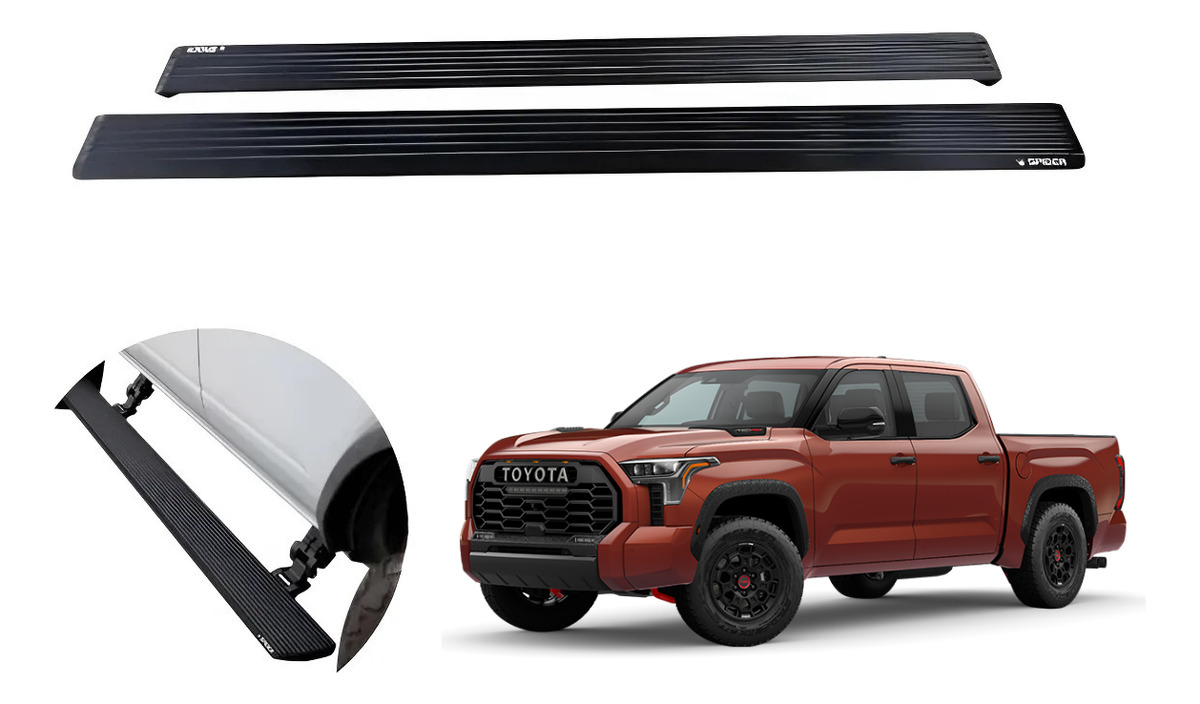 Estribos eléctricos automáticos diseñados específicamente para Toyota Tundra 2023–2025. Mejoran significativamente el acceso al vehículo, brindando mayor comodidad y seguridad al subir y bajar, especialmente en unidades de mayor altura.