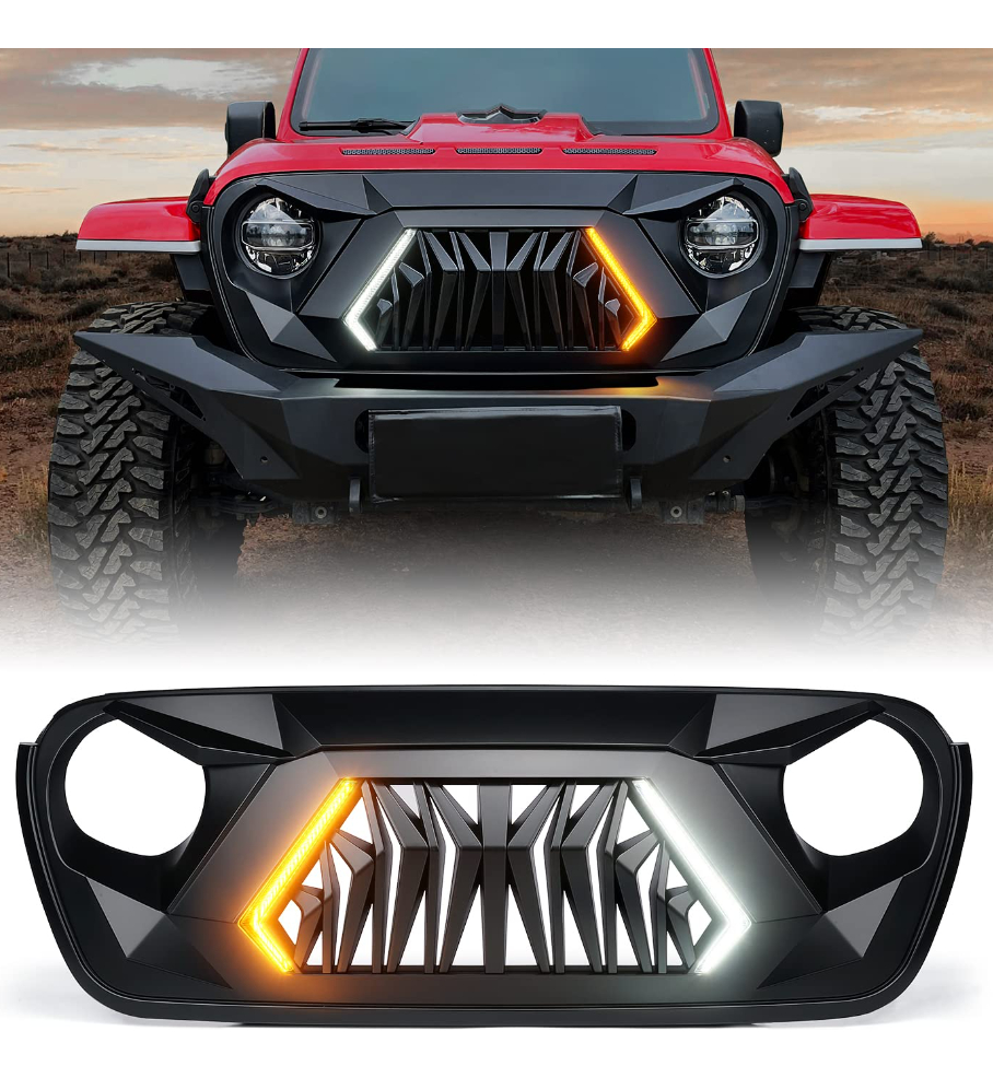 Transforma el frente de tu Jeep con esta parrilla estilo Tiburón equipada con iluminación LED en color blanco y ámbar. Su diseño agresivo y moderno brinda una apariencia imponente, ideal para quienes buscan destacar tanto en ciudad como en rutas off road.
