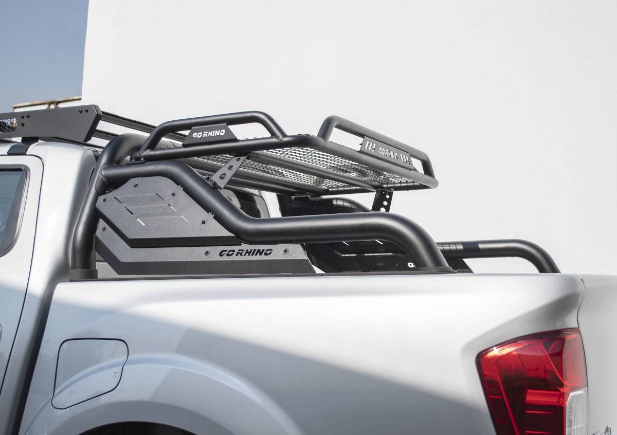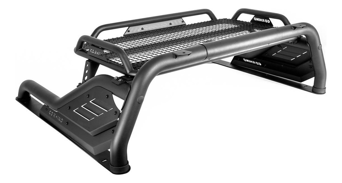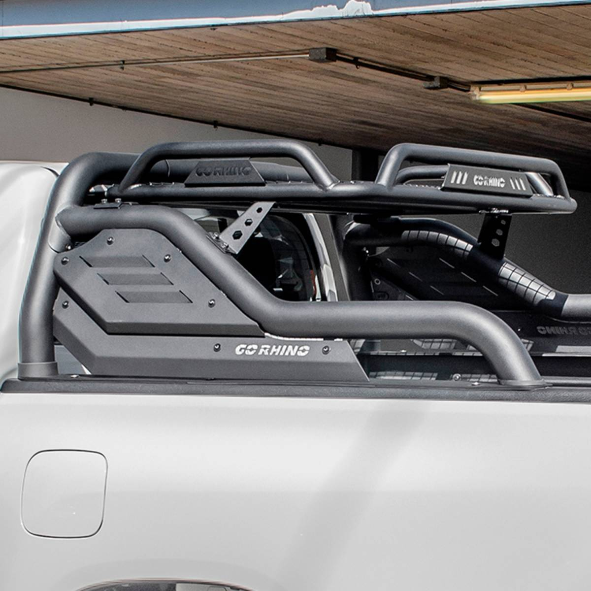 Roll bar Go Rhino con canastilla incluida, diseño robusto que combina la estética de un roll bar con la practicidad de contar con un espacio de carga adicional en la batea de la pick up.