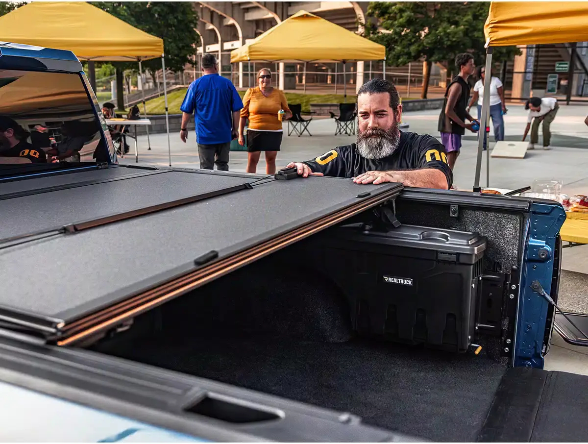 Si las inclemencias del tiempo son un problema, no se preocupe. El BAKFlip MX4 es tan resistente a la humedad como a los ladrones. Los sellos perimetrales de caucho EPDM de primera calidad evitan filtraciones entre la cubierta de la caja y los rieles de la misma, mientras que un sello de doble acción en el portón trasero lo protege de las inclemencias del tiempo. Este diseño innovador también mejora el funcionamiento, lo que le permite abrir y cerrar el portón trasero independientemente de la posición de la cubierta.
